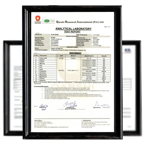 Our Hindukush Royal Shilajit is rigorously tested by Qarshi Analytical Laboratory, a trusted ISO/IEC 17025 accredited facility, ensuring the highest standards of quality and safety.